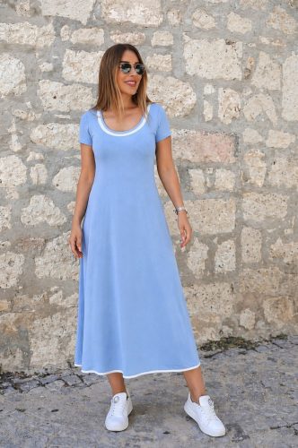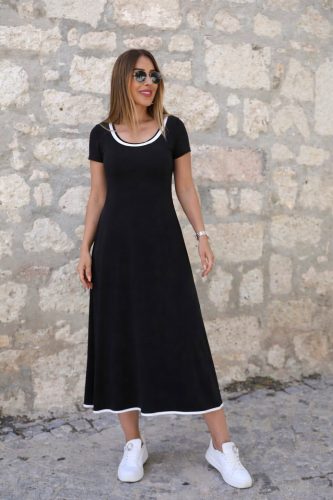 Kadın kısa kollu yuvarlak yakalı yakası renkli kiloş midi viskon elbise